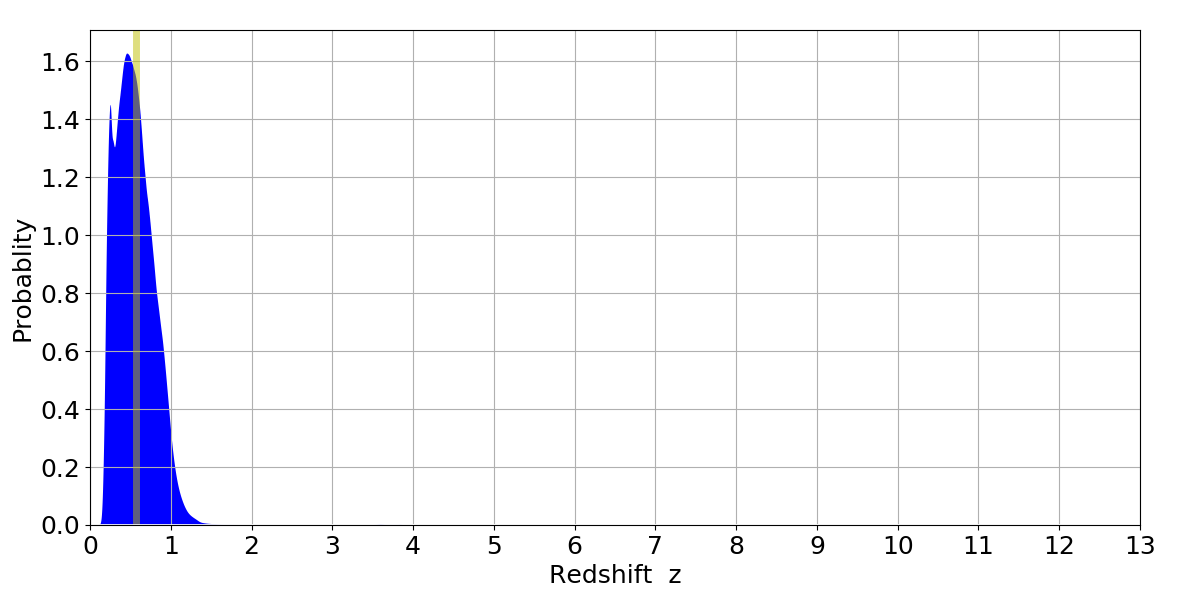In P(z) plots: Yellow lines mark the cluster redshift z = 0.570,