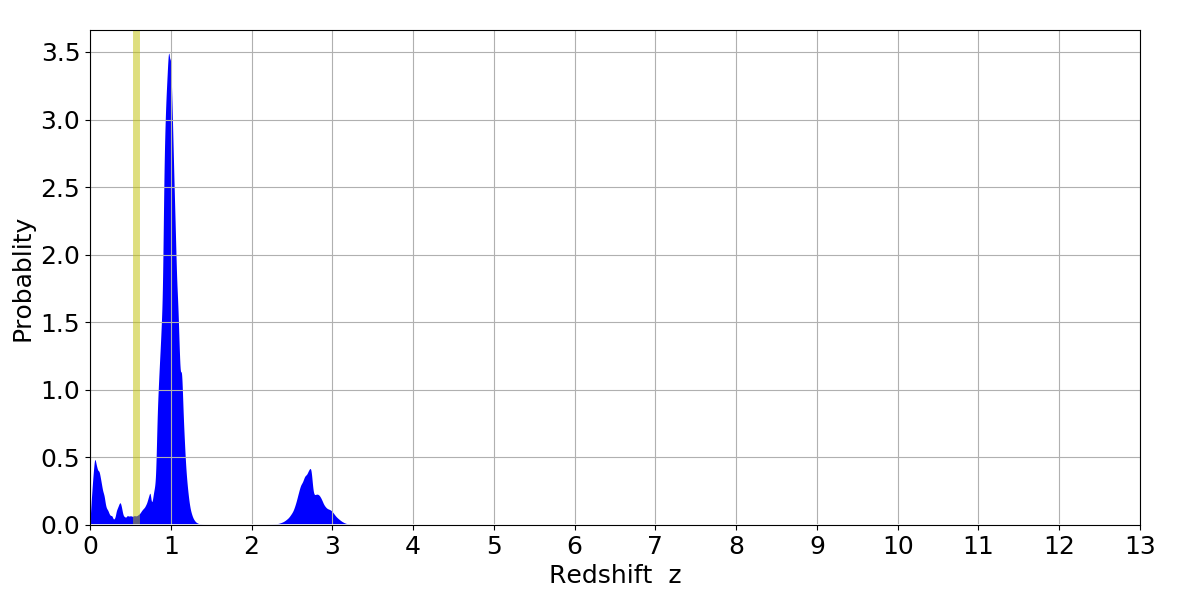 In P(z) plots: Yellow lines mark the cluster redshift z = 0.570,