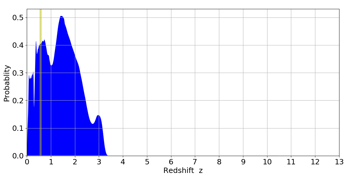 In P(z) plots: Yellow lines mark the cluster redshift z = 0.570,