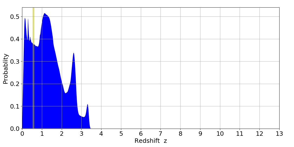 In P(z) plots: Yellow lines mark the cluster redshift z = 0.570,