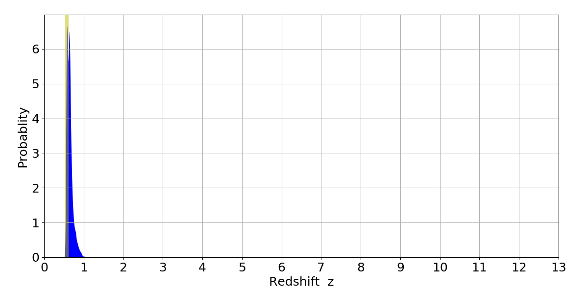 In P(z) plots: Yellow lines mark the cluster redshift z = 0.570,