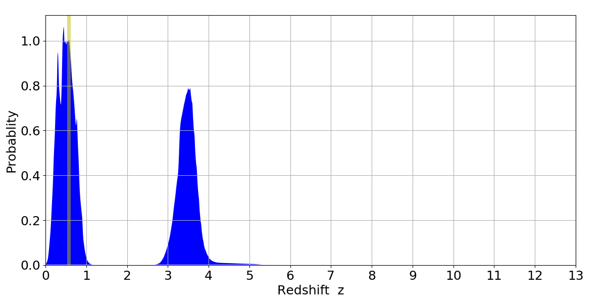 In P(z) plots: Yellow lines mark the cluster redshift z = 0.570,