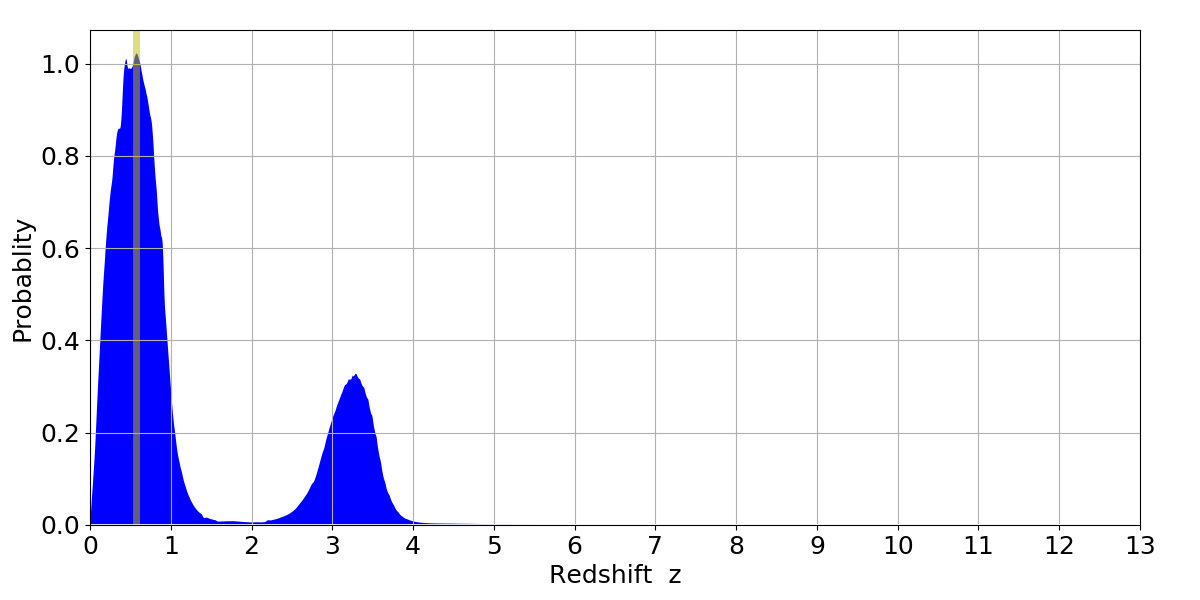 In P(z) plots: Yellow lines mark the cluster redshift z = 0.570,