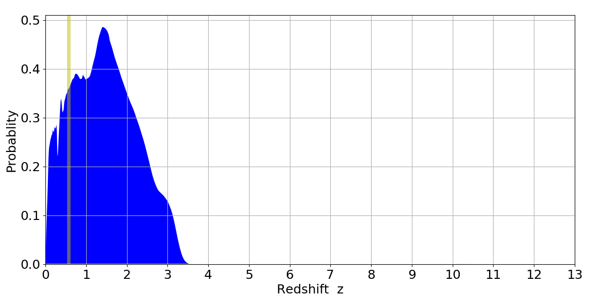 In P(z) plots: Yellow lines mark the cluster redshift z = 0.570,