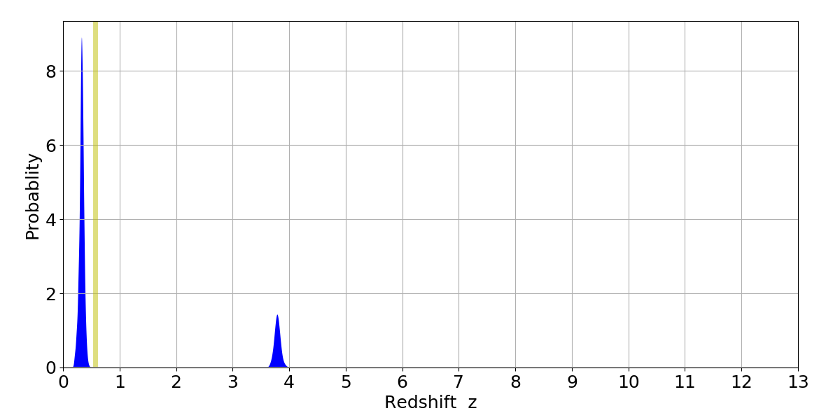 In P(z) plots: Yellow lines mark the cluster redshift z = 0.570,