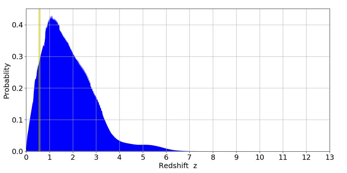 In P(z) plots: Yellow lines mark the cluster redshift z = 0.570,