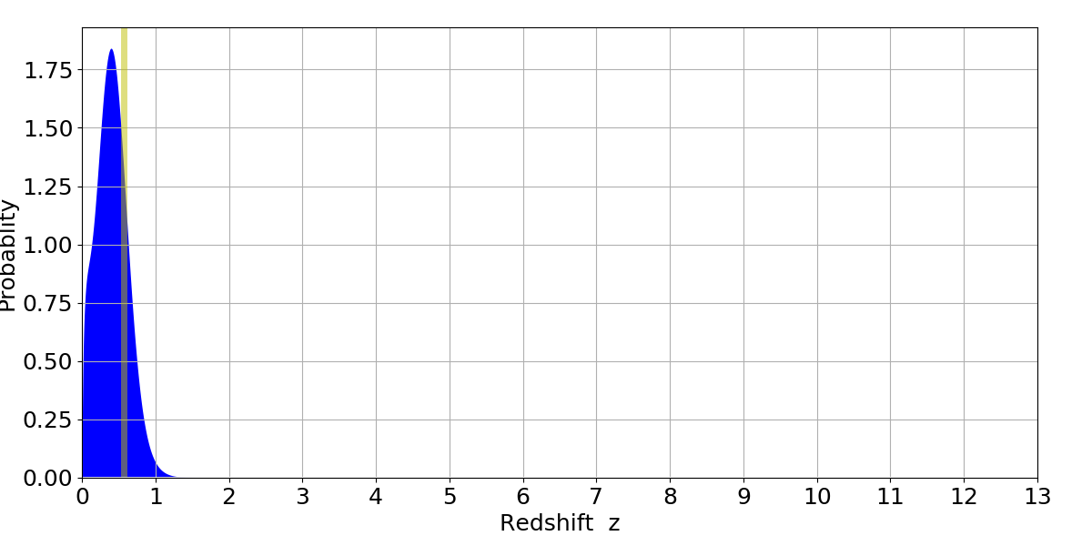 In P(z) plots: Yellow lines mark the cluster redshift z = 0.570,