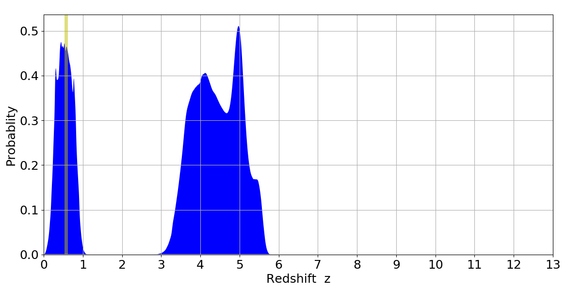 In P(z) plots: Yellow lines mark the cluster redshift z = 0.570,