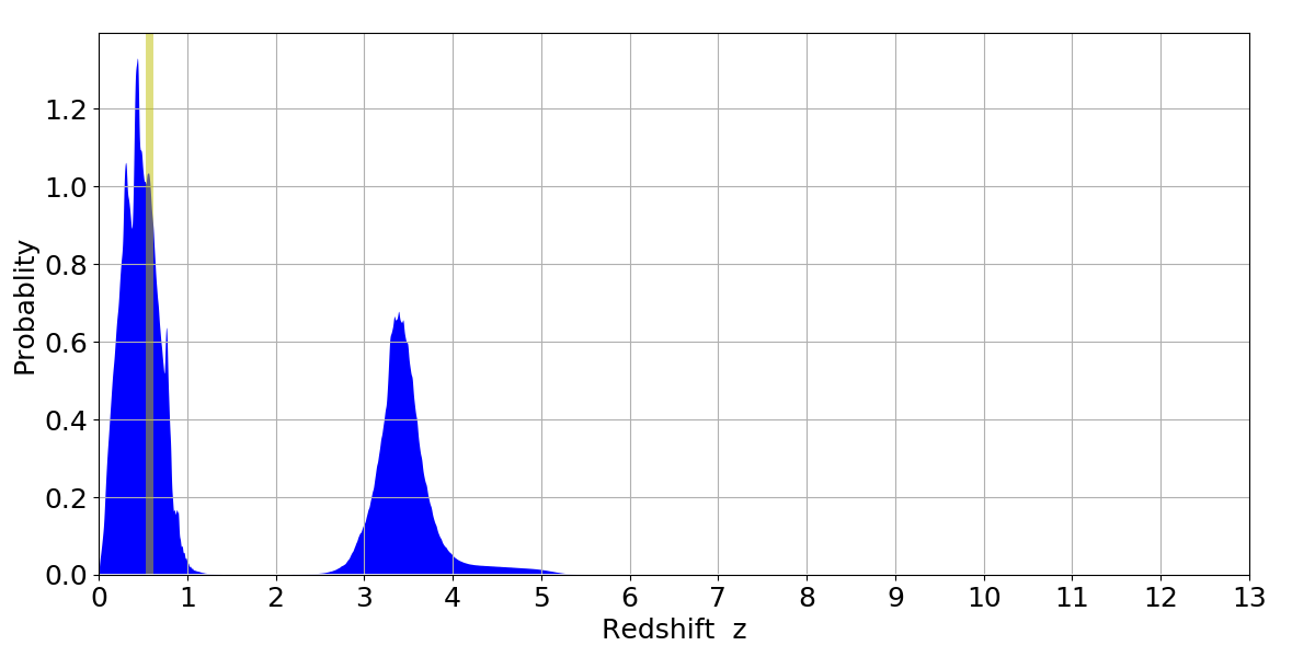 In P(z) plots: Yellow lines mark the cluster redshift z = 0.570,