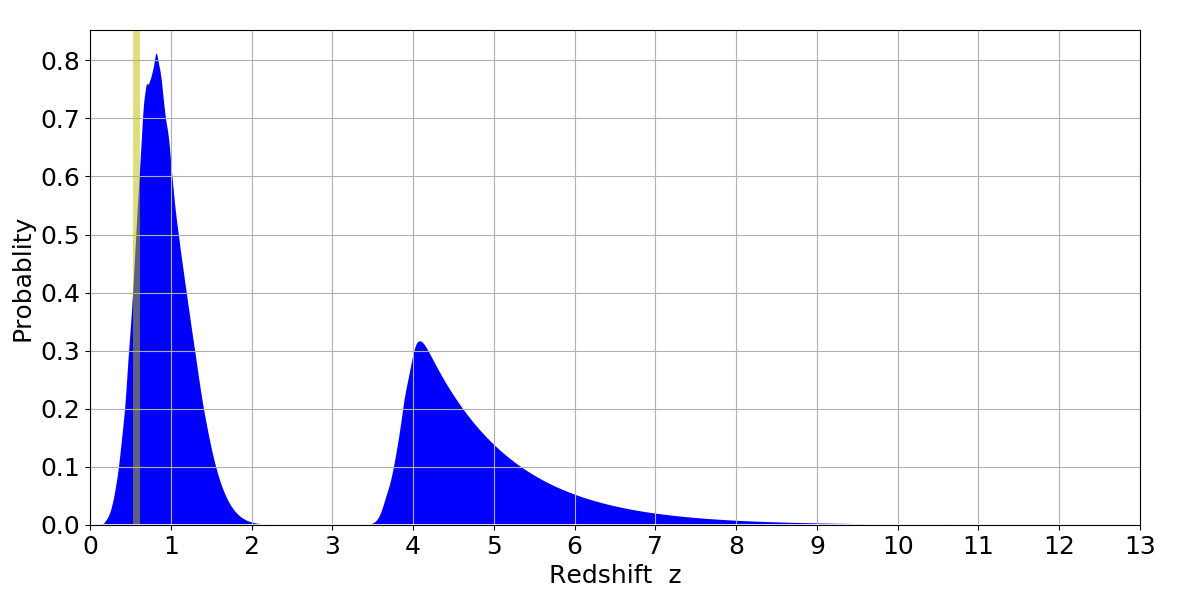 In P(z) plots: Yellow lines mark the cluster redshift z = 0.570,