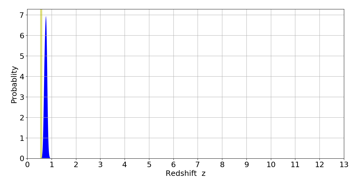 In P(z) plots: Yellow lines mark the cluster redshift z = 0.570,