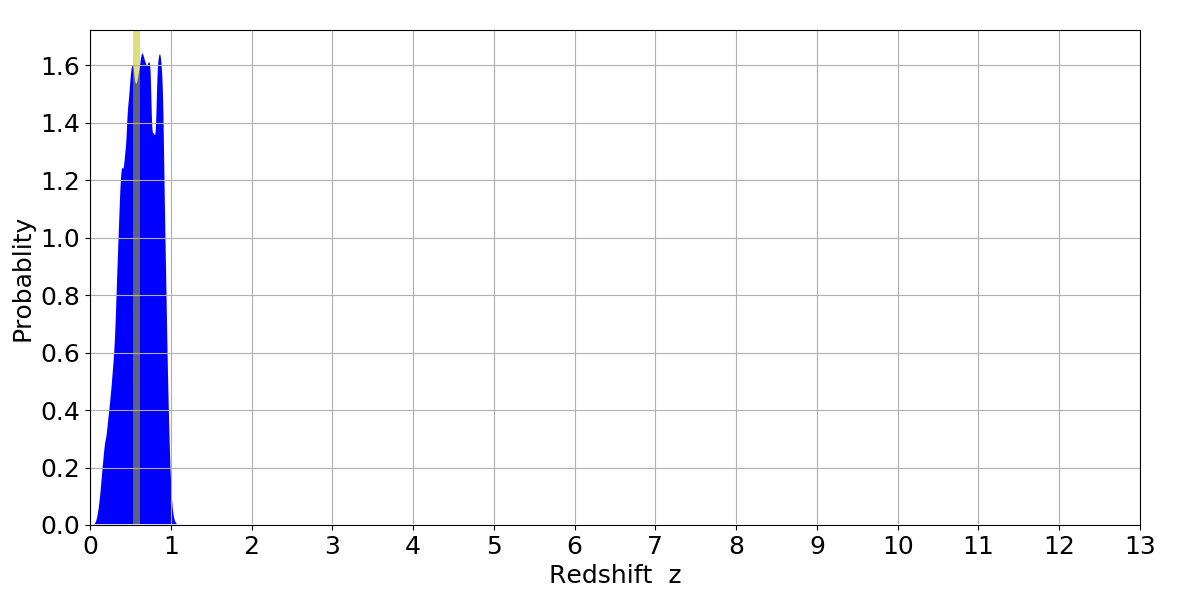 In P(z) plots: Yellow lines mark the cluster redshift z = 0.570,