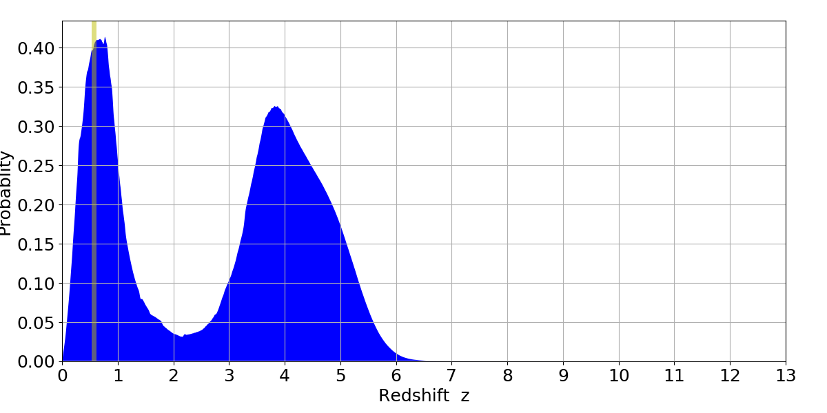 In P(z) plots: Yellow lines mark the cluster redshift z = 0.570,
