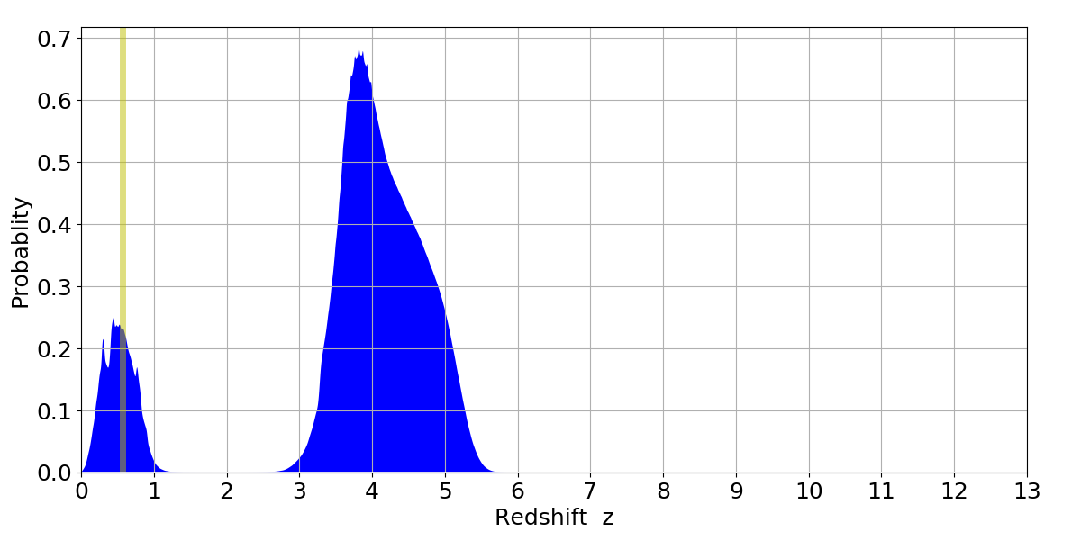 In P(z) plots: Yellow lines mark the cluster redshift z = 0.570,