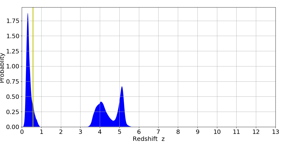 In P(z) plots: Yellow lines mark the cluster redshift z = 0.570,