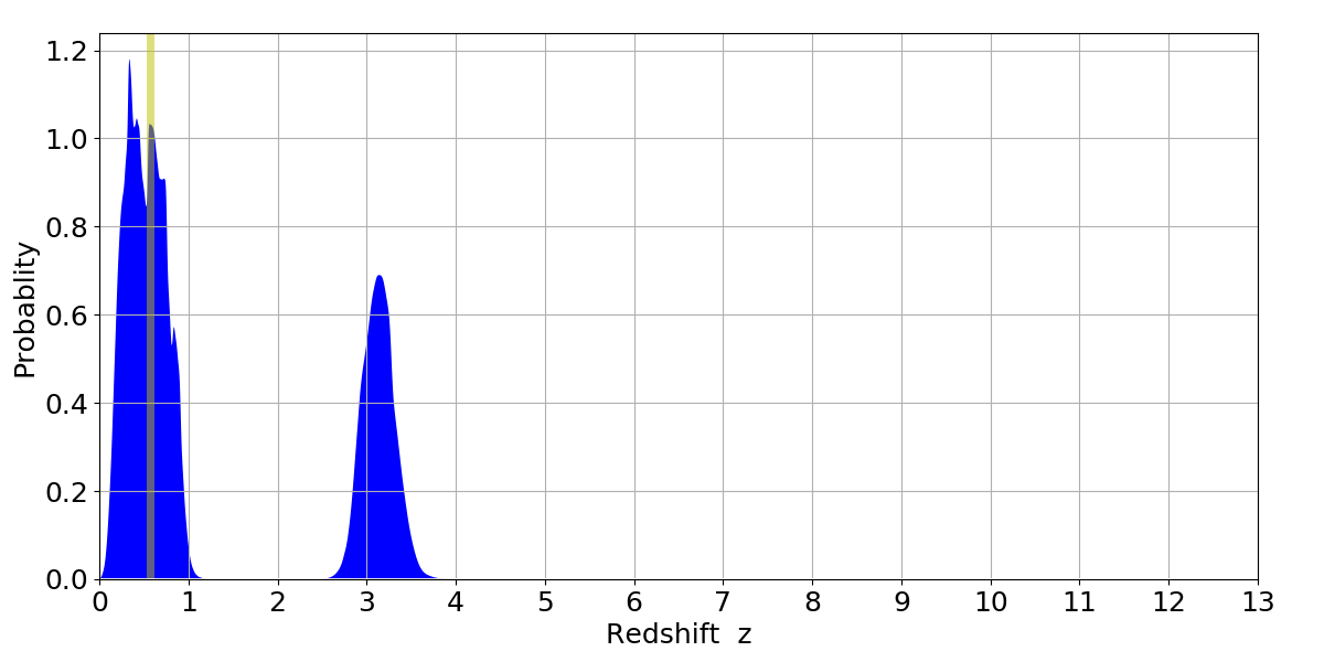 In P(z) plots: Yellow lines mark the cluster redshift z = 0.570,