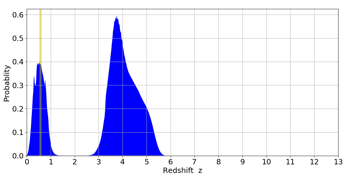 In P(z) plots: Yellow lines mark the cluster redshift z = 0.570,