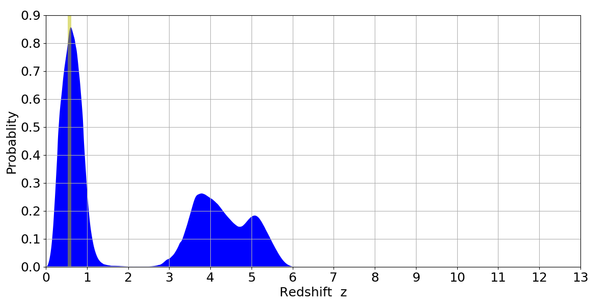 In P(z) plots: Yellow lines mark the cluster redshift z = 0.570,