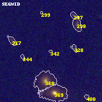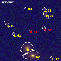 Object #342 x,y = (5007, 5046) RA, Dec = (11:57:58.224, -10:45:52.56) = (179.49260, -10.76460) BPZ = 0.613 [0.246--5.356] type = 8.20 (SB1_B10 - SB2_B10) chisq2 = 1.51 ODDS = 0.06 z_cluster = 0.570