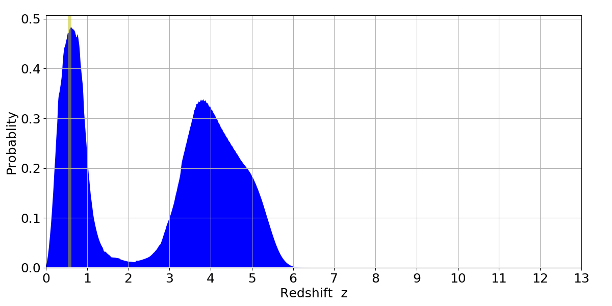 In P(z) plots: Yellow lines mark the cluster redshift z = 0.570,