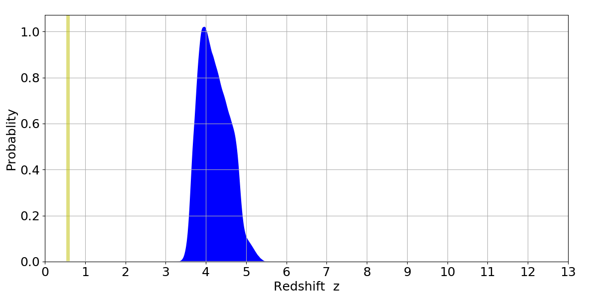 In P(z) plots: Yellow lines mark the cluster redshift z = 0.570,