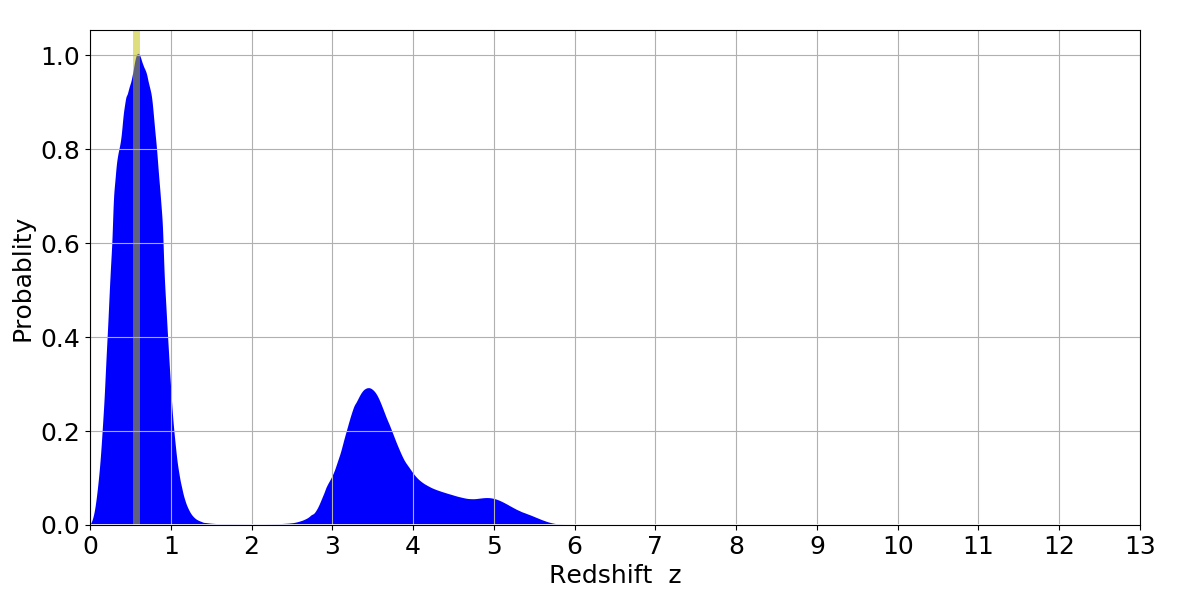 In P(z) plots: Yellow lines mark the cluster redshift z = 0.570,