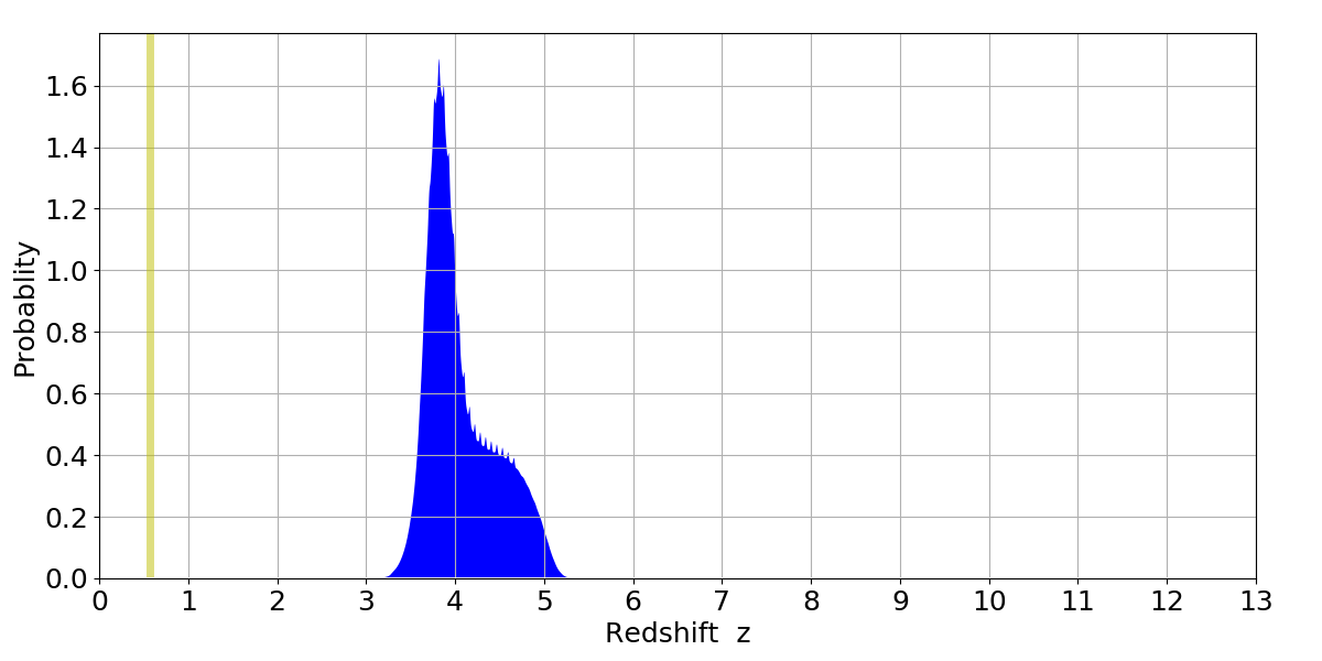In P(z) plots: Yellow lines mark the cluster redshift z = 0.570,