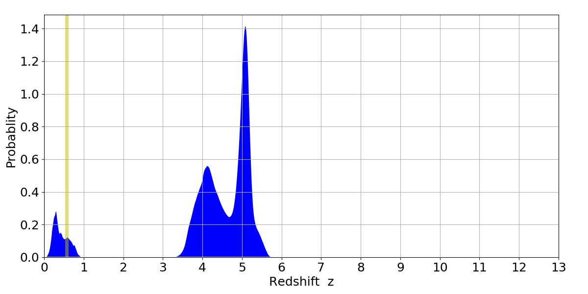 In P(z) plots: Yellow lines mark the cluster redshift z = 0.570,