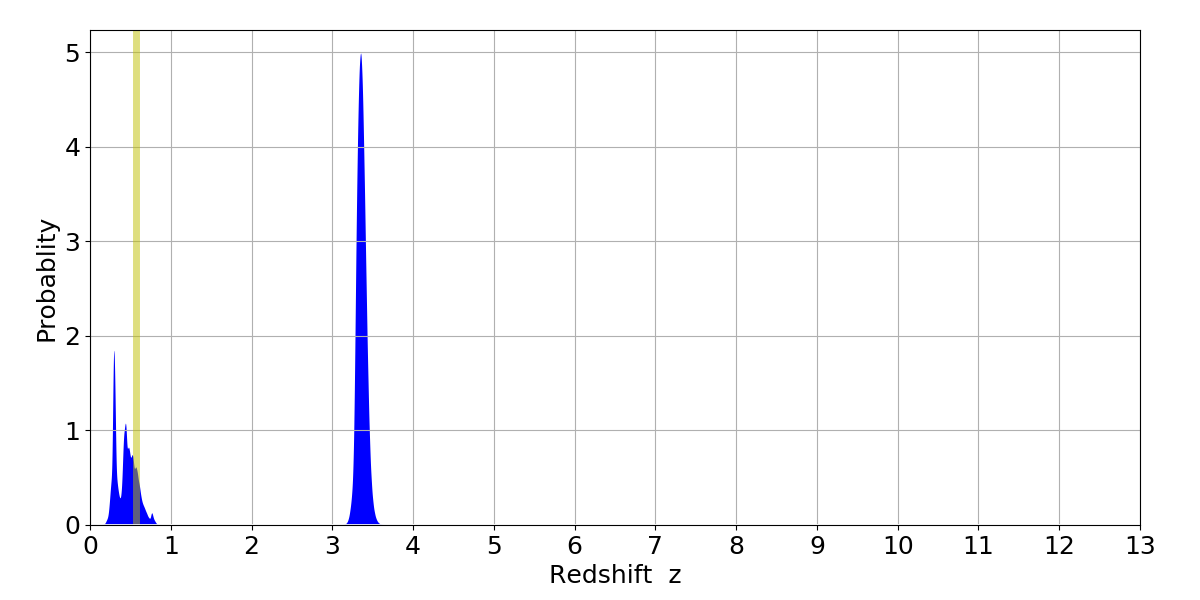 In P(z) plots: Yellow lines mark the cluster redshift z = 0.570,