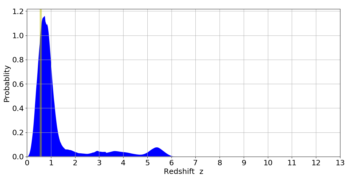 In P(z) plots: Yellow lines mark the cluster redshift z = 0.570,