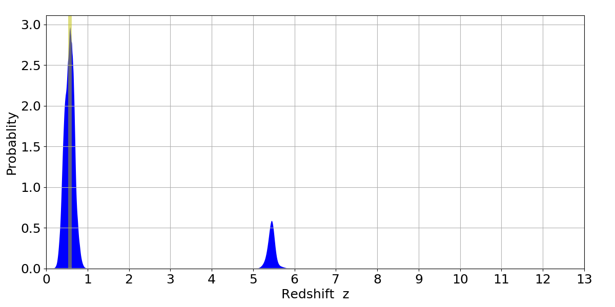 In P(z) plots: Yellow lines mark the cluster redshift z = 0.570,