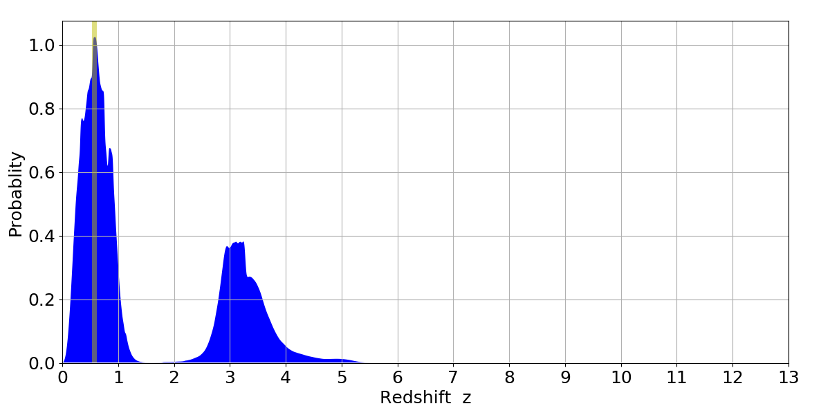 In P(z) plots: Yellow lines mark the cluster redshift z = 0.570,