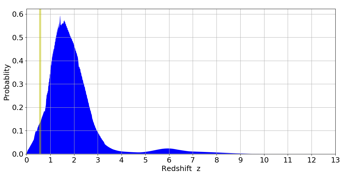 In P(z) plots: Yellow lines mark the cluster redshift z = 0.570,