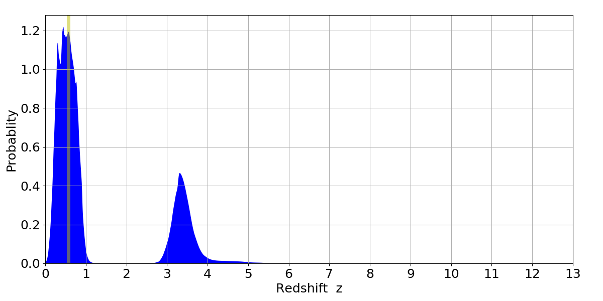 In P(z) plots: Yellow lines mark the cluster redshift z = 0.570,