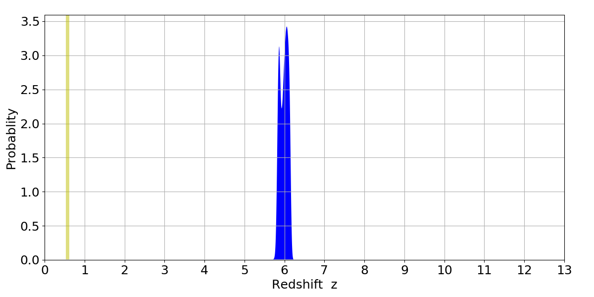 In P(z) plots: Yellow lines mark the cluster redshift z = 0.570,