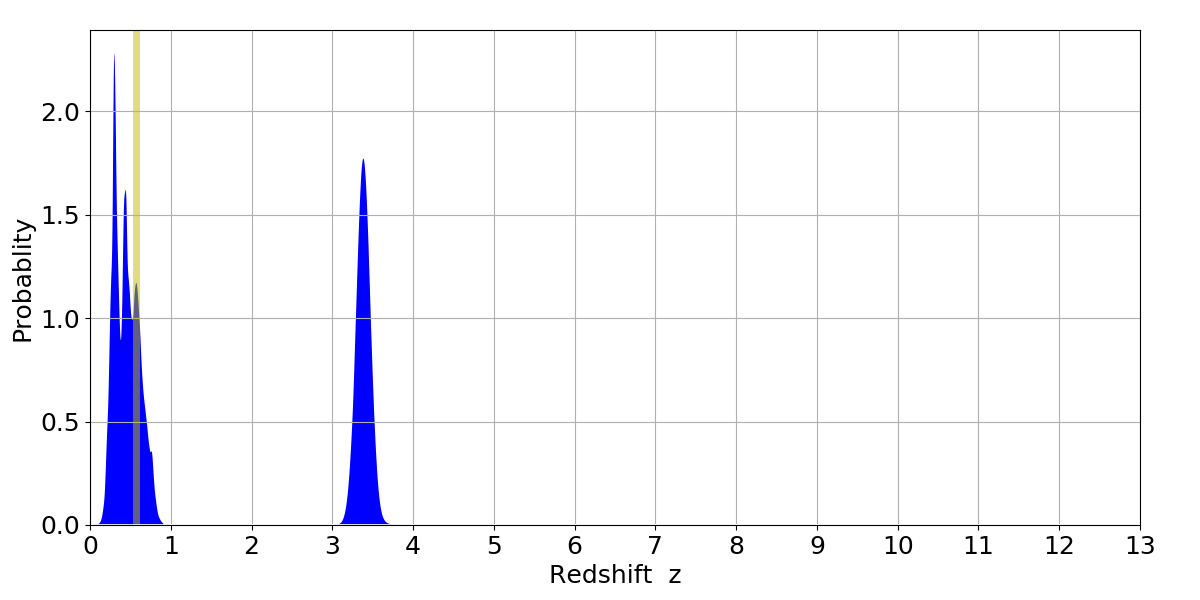 In P(z) plots: Yellow lines mark the cluster redshift z = 0.570,