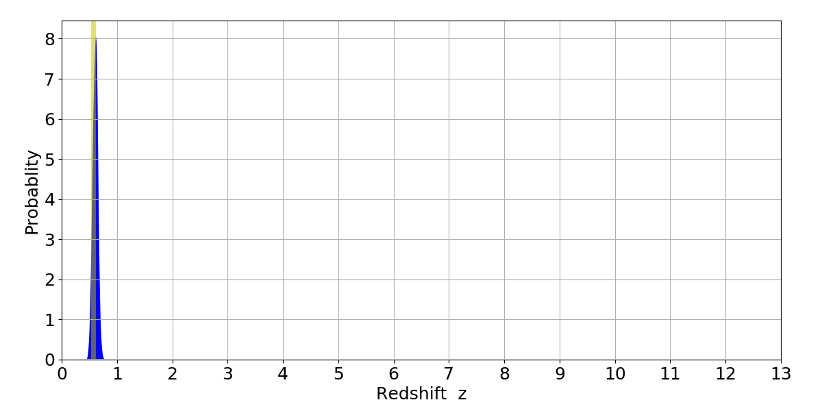 In P(z) plots: Yellow lines mark the cluster redshift z = 0.570,