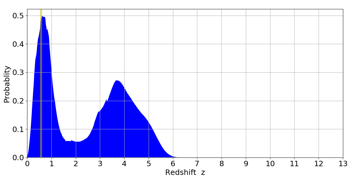 In P(z) plots: Yellow lines mark the cluster redshift z = 0.570,