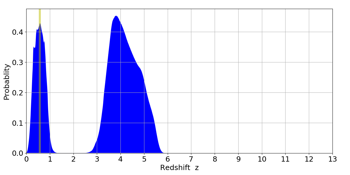 In P(z) plots: Yellow lines mark the cluster redshift z = 0.570,