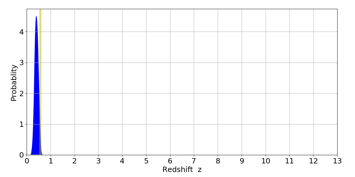 In P(z) plots: Yellow lines mark the cluster redshift z = 0.570,