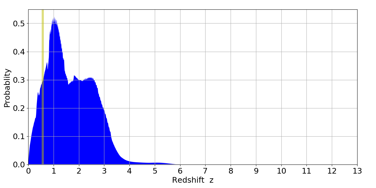 In P(z) plots: Yellow lines mark the cluster redshift z = 0.570,