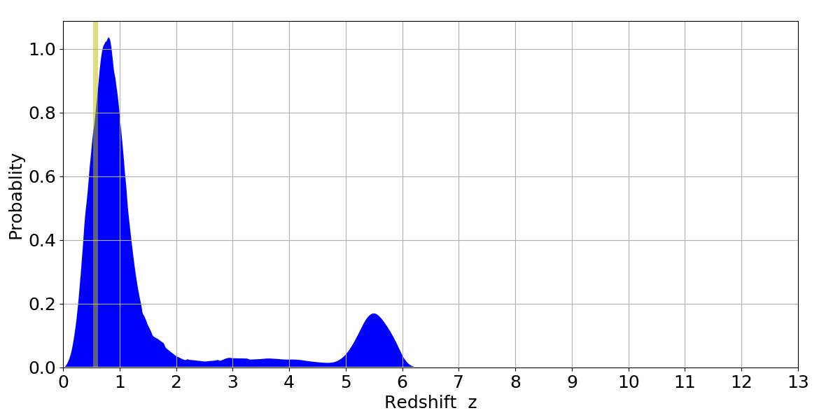 In P(z) plots: Yellow lines mark the cluster redshift z = 0.570,