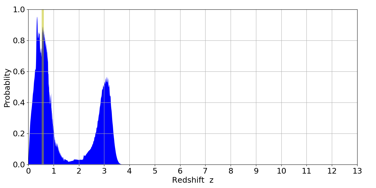 In P(z) plots: Yellow lines mark the cluster redshift z = 0.570,
