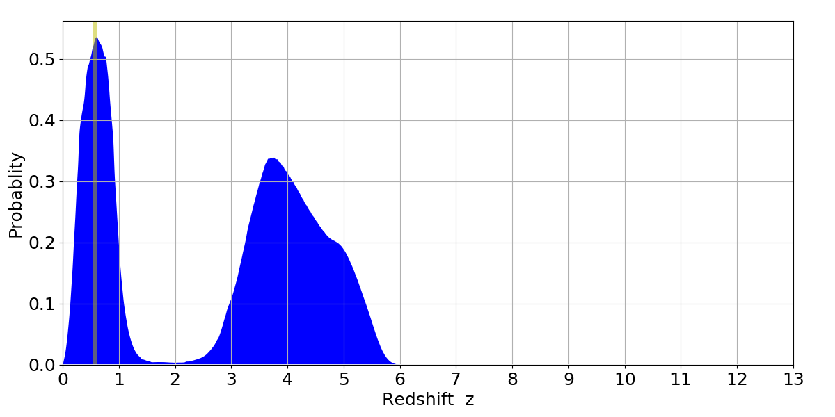 In P(z) plots: Yellow lines mark the cluster redshift z = 0.570,