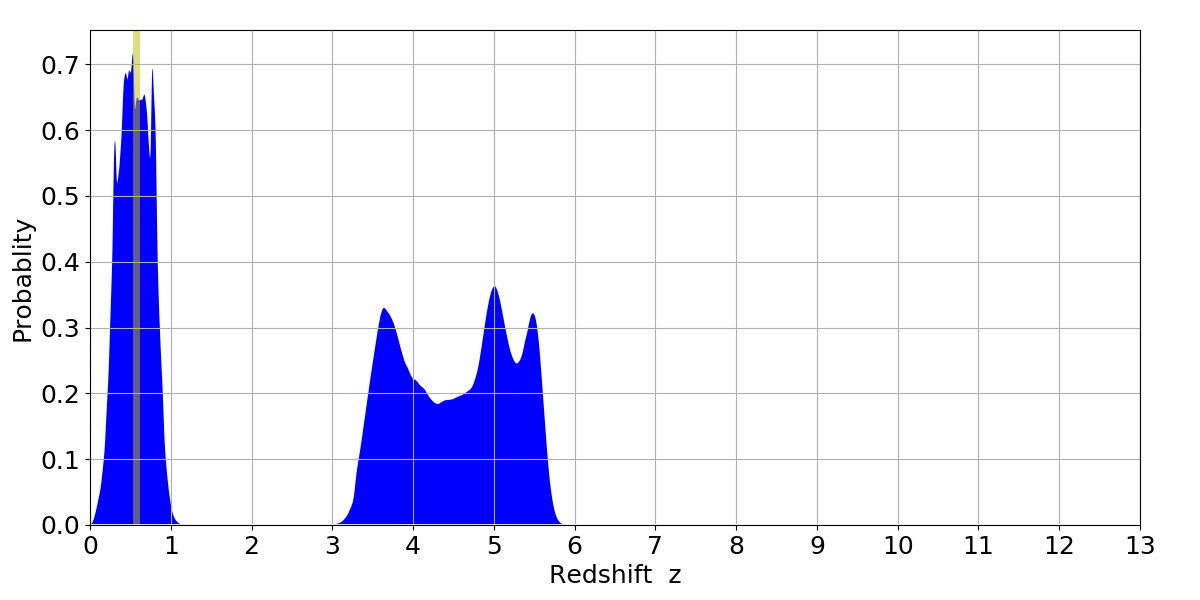 In P(z) plots: Yellow lines mark the cluster redshift z = 0.570,