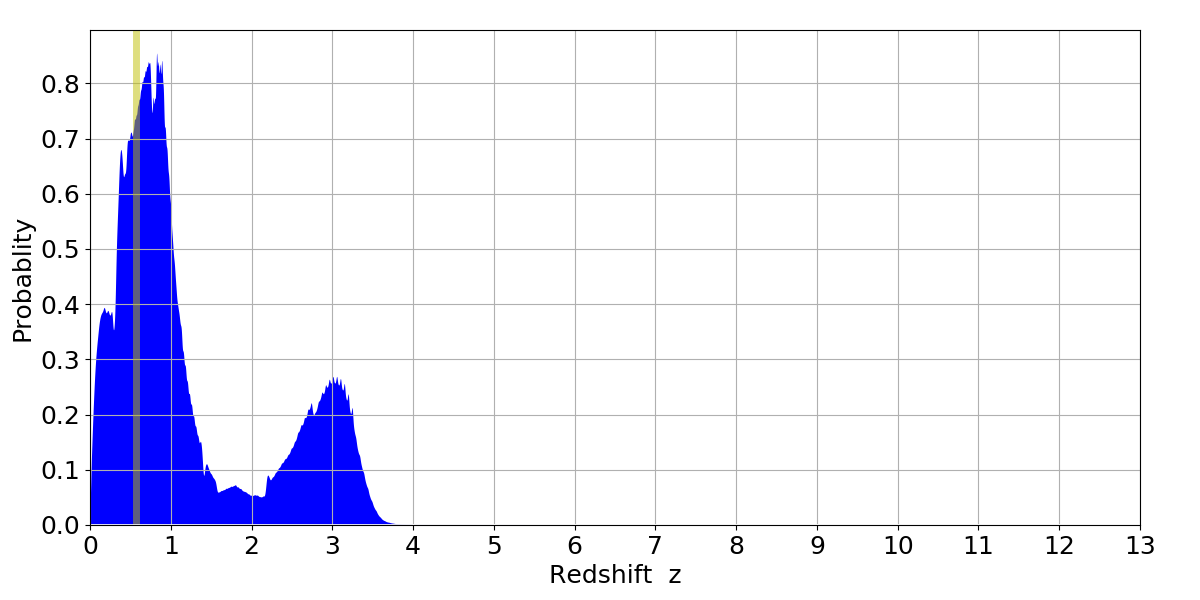 In P(z) plots: Yellow lines mark the cluster redshift z = 0.570,