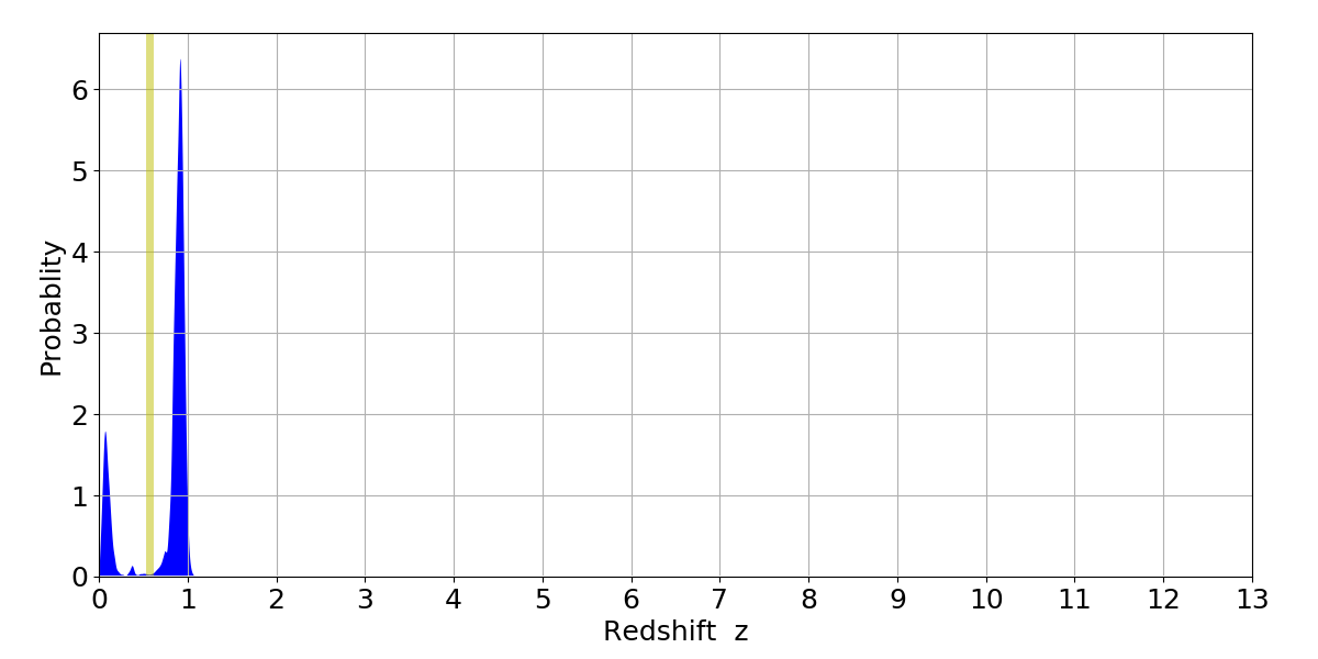 In P(z) plots: Yellow lines mark the cluster redshift z = 0.570,