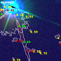 Object #69 x,y = (5319, 5659) RA, Dec = (11:57:56.952, -10:45:15.84) = (179.48730, -10.75440) BPZ = 0.593 [0.180--4.831] type = 9.30 (SB2_B10 - SB3_B10) chisq2 = 0.18 ODDS = 0.08 z_cluster = 0.570