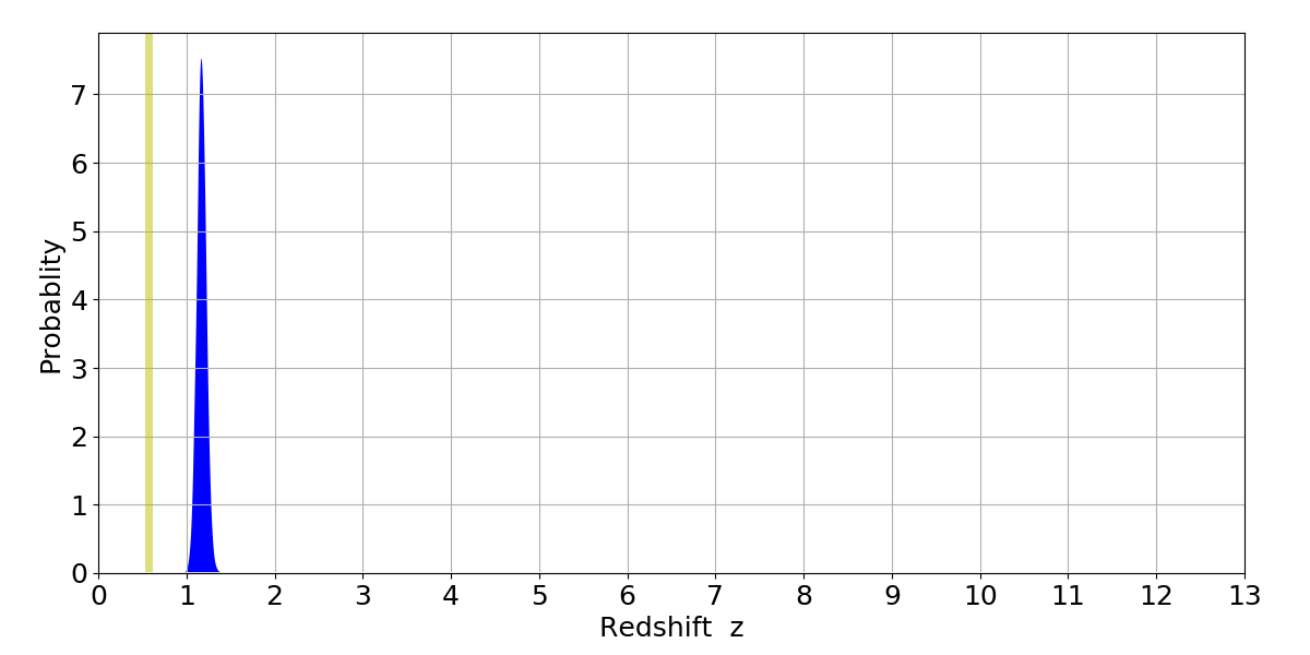 In P(z) plots: Yellow lines mark the cluster redshift z = 0.570,
