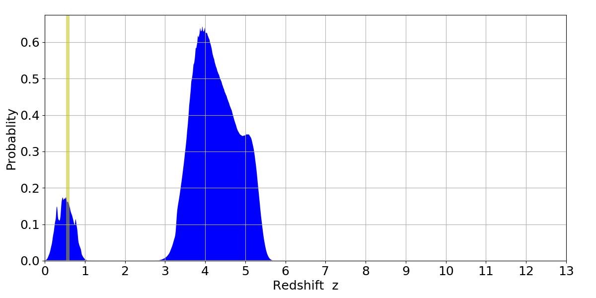 In P(z) plots: Yellow lines mark the cluster redshift z = 0.570,